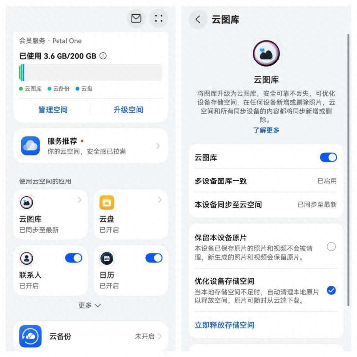 强烈建议大家拿到新机后,第一时间开启“云图库”的“优化设备存储空间”功能。旅途中拍的那几百张高清大片和4K视频,会自动同步到云端,而在手机本地只保留预览图。