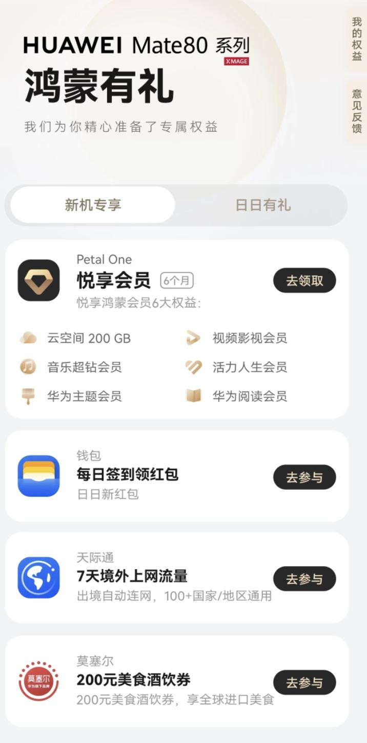 最后,给各位新机用户划个重点!一定要记得去薅羊毛! 现在购买华为Mate 80系列新机,去手机负一屏的“鸿蒙有礼”,可以免费领取新机权益。里面包含6个月的Petal One悦享套餐,直接送你200GB的华为云空间。这波福利刚好能覆盖你半年的照片备份需求,千万别错过了!