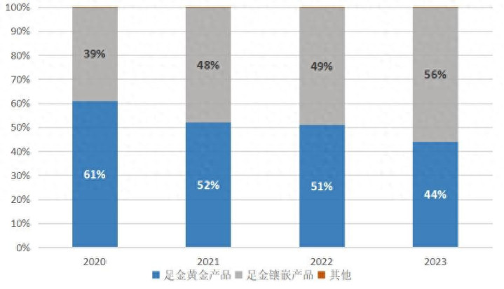 老铺黄金的定价策略亦是基于产品,与古法金结合彩宝、珐琅等材料的足金镶嵌产品之收入占比在逐年提高,2023年足金镶嵌产品的收入占比已经达到了56%。定价策略驱动下的产品结构表明,老铺黄金在引导消费者将关注的重点放在产品设计和文化内涵上,在加深品牌心智的同时,持续弱化金价对产品价格的影响。